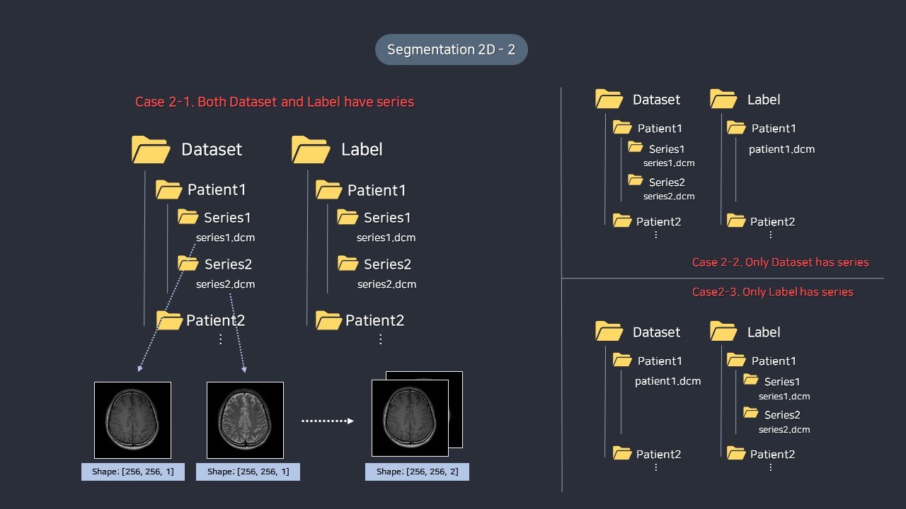 - 영상 데이터 혹은 라벨 데이터만 Series로 구분되어 있을 수도 있고, 영상 데이터와 라벨 데이터 모두 Series로 구분되어 있을 수도 있습니다.